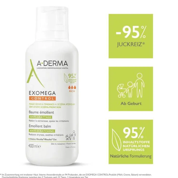 A-Derma Exomega Control Balsam ist ein natürlicher rückfettender Anti-Juckreiz-Balsam. Er mildert Trockenheit, Rötungen und Irritationen und reduziert den Juckreiz¹ um 95% bei trockener, zu Neurodermitis neigender Haut.