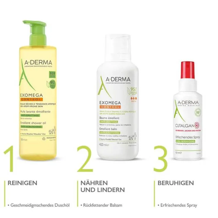 ² Interne Anwenderstudie mit 94 Probanden, die ein Exomega Control-Produkt (Milch – Creme – Balsam) verwendeten. Durchschnittliche Ergebnisse zwischen den 3 Texturen nach 22 Tagen.