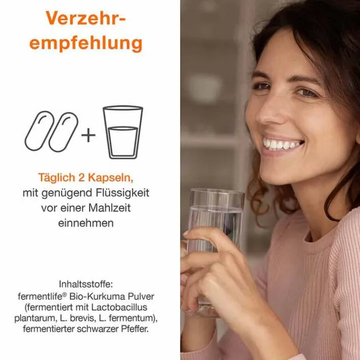 Fermentlife Bio-Kurkuma Pulver (fermentiert mit Lactobacillus plantarum, L. brevis, L. fermentum), fermentierter schwarzer Pfeffer. Kapselhülle: Cellulose.
