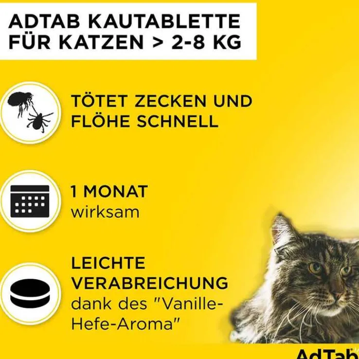 AdTab™ Kautabletten für Katzen über 2 bis 8 kg Körpergewicht sind ein orales Zeckenmittel in praktischer Tablettenform und ohne Rezept erhältlich. Sie bieten einen effektiven Zecken- und Flohschutz für die Katze für einen ganzen Monat. Flöhe und Zecken werden innerhalb von wenigen Stunden nach der Gabe für die Dauer von einem Monat rasch abgetötet. Dies verhindert eine Eiablage durch Flöhe. Der Vermehrungszyklus von Flöhen wird dadurch gestoppt und eine Kontamination der Umgebung reduziert.