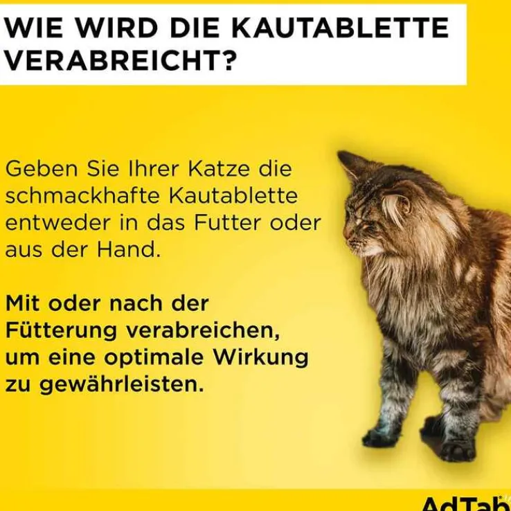 Zur optimalen Wirkung von AdTab™ sollte die Tablette entweder direkt mit oder innerhalb von 30 Minuten nach der Fütterung gegeben werden. Alternativ kann AdTab™ auch unmittelbar nach der Mahlzeit – in Wurst oder Käse gewickelt – gefüttert werden.