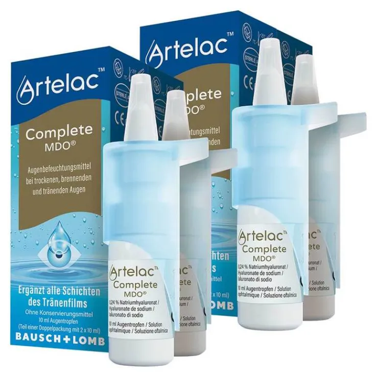 Artelac® Complete MDO® Augentropfen zur Befeuchtung trockener Augen lindern zielgerichtet die Defizite des natürlichen Tränenfilms und die Augenoberfläche ist bereits mit einem Tropfen rundum sicher gut versorgt. Die Augentropfen mit Lipiden schützen den Tränenfilm vor einer vermehrten Verdunstung, der natürliche Feuchtigkeitsspender Hyaluronsäure (0,24 %) und Glycerin binden Feuchtigkeit, das Carbomer befeuchtet und bindet zusätzlich Wasser. Anwender:innen erleben eine umgehende und intensive, langanhaltende Linderung ihrer Symptome.
