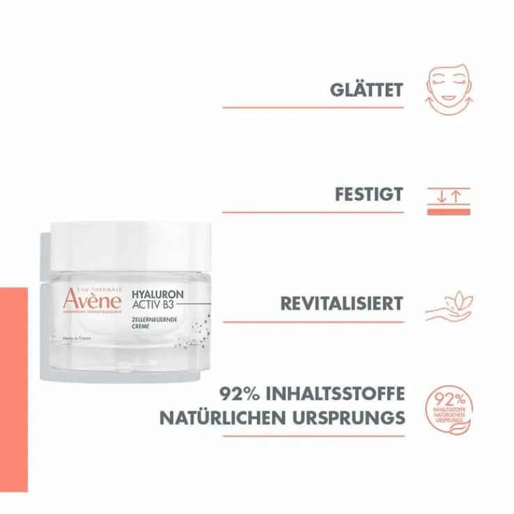 Die Hyaluron Activ B3 zellerneuernde Creme von Eau Thermale Avene ist eine Anti-Aging-Tagescreme, die entwickelt wurde, um den Zeichen der Hautalterung entgegenzuwirken. Mit einer Konzentration von 0,2 Prozent reiner Hyaluronsäure (hohes und geringes Molekulargewicht) und 6 Prozent Niacinamid revitalisiert diese Creme die Haut, macht sie straffer und reduziert Falten effektiv.