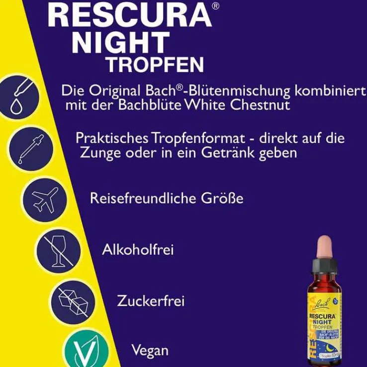 Die einzigartige Mischung der Bach Rescura™ Night Tropfen besteht aus der traditionellen Original Bach-Blütenmischung und der zusätzlichen Bach-Blüte White Chestnut.