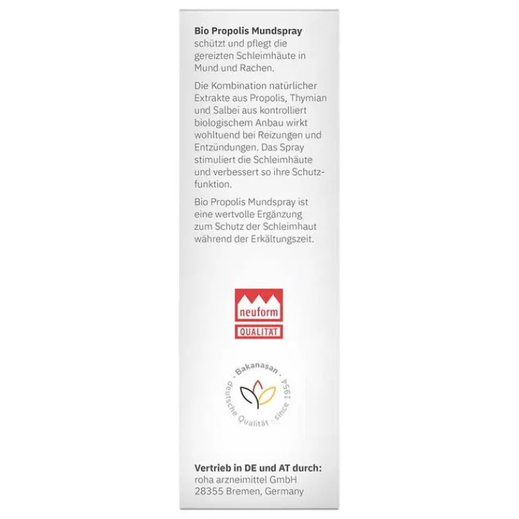 Bio Propolis Mundspray schützt und pflegt die gereizten Schleimhäute in Mund und Rachen. Die Kombination natürlicher Extrakte aus Propolis, Thymian und Salbei aus kontrolliert biologischem Anbau wirkt wohltuend bei Reizungen und Entzündungen. Das Spray stimuliert die Schleimhäute und verbessert so ihre Schutzfunktion. Bio Propolis Mundspray ist eine wertvolle Ergänzung zum Schutz der Schleimhaut während der Erkältungszeit.