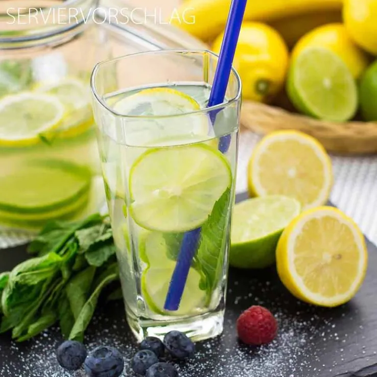 Isotoner Drink: 1 ML Basenpulver pur mit 1 L Wasser/Sprudel und einem Spritzer Zitronensaft mischen.