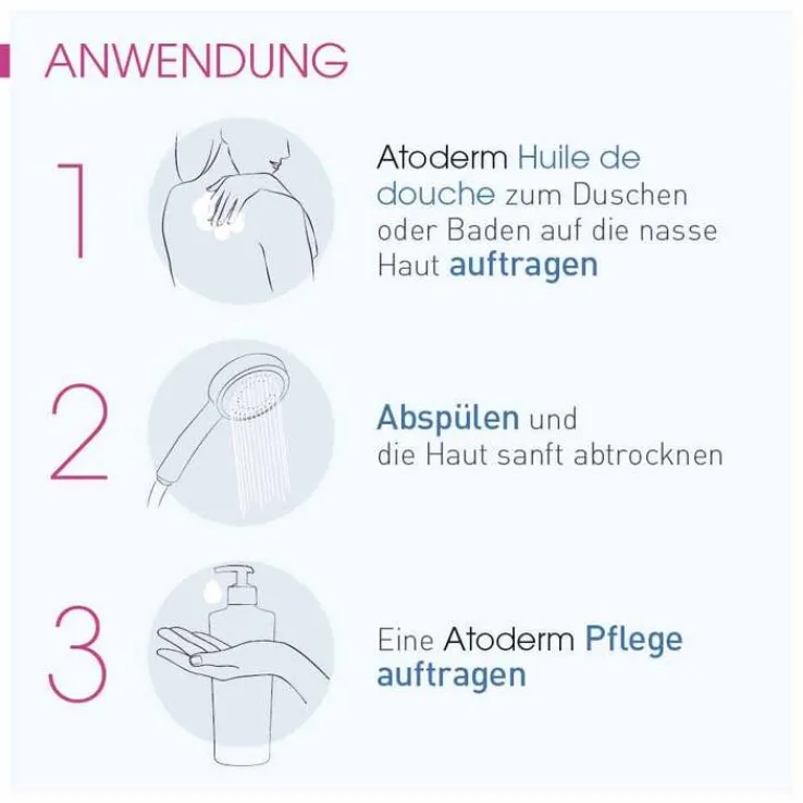 Bei Bedarf Atoderm Huile de douche täglich auf die feuchte Haut geben, mit Wasser aufschäumen und abspülen. Tipp zum Baden: 2-3 Pumpstöße in das Badewasser geben.