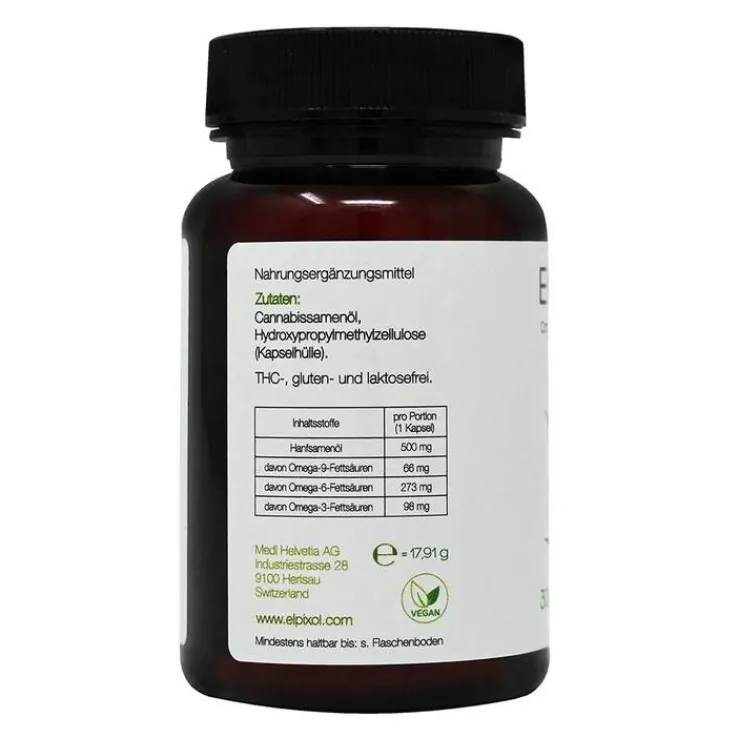 Die Elpixol Cannabis-Kapseln sind die perfekte pflanzliche Alternative für alle, die sich gesund ernähren und einen aktiven Lebensstil führen wollen. Sie enthalten Hanfsamenöl, das ein wertvolles Öl ist. Es ist reich an Mineralien, Vitaminen und den essenziellen Fettsäuren Omega-3- , Omega-6- und Omega-9-Fettsäure, die der Körper nicht selbst herstellen kann.