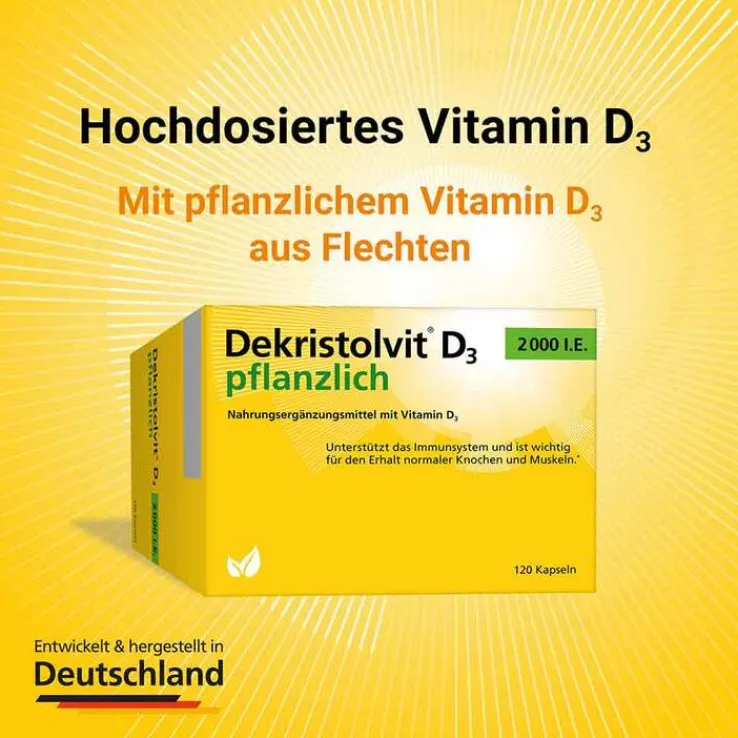 Auch Dekristolvit 2000 I.E. pflanzlich stärkt das Immunsystem* und trägt zur Erhaltung normaler Knochen und der Muskelfunktion bei.* Es ist vegan, gluten- und lactosefrei und somit für alle geeignet, die bei ihrer alltäglichen Vitamin-D-Versorgung auf pflanzliche und nachhaltige Ernährung achten.