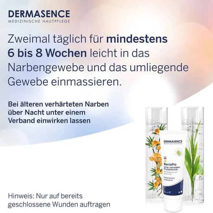 Tipp: Ein möglichst früher Beginn der Anwendung bewirkt den besten Pflegeeffekt. Bei verhärteten, älteren Narben die Emulsion über Nacht unter einem Verband einwirken lassen.