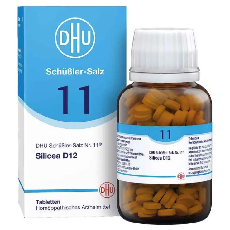 DHU Schüßler-Salz Nr. 11® Silicea D12 Anwendungsgebiete: Registriertes homöopathisches Arzneimittel, daher ohne Angabe einer therapeutischen Indikation. Zu Risiken und Nebenwirkungen lesen Sie die Packungsbeilage und fragen Sie Ihre Ärztin, Ihren Arzt oder in Ihrer Apotheke. Enthält Lactose und Weizenstärke. Packungsbeilage beachten! Deutsche Homöopathie-Union DHU-Arzneimittel GmbH & Co. KG, Karlsruhe