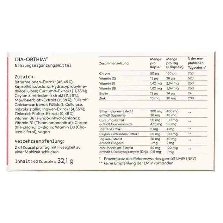 Dia-Orthim besteht aus einer einzigartigen Zusammensetzung und ist frei von Fructose, Gluten und Lactose – einfach und natürlich. Wichtige Inhaltstoffe sind z.B. Bittermelonen-, Curcuma-, Pfeffer-, Ingwer-, Maulbeerblatt- und Ceylon Zimtrinden-Extrakt.
