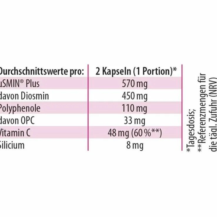 Die Tagesdosis (2 Kapseln) Diosmin OPC ProVenis enthält 570 mg μsmin® Plus, 105 mg Polyphenole aus Traubenkernen aus Frankreich (davon 33 mg OPC), 110 mg roten Weinrebenblätter-Extrakt (Quercetin, Kaempferol) und 48 mg Vitamin C (Acerolakirsche).
