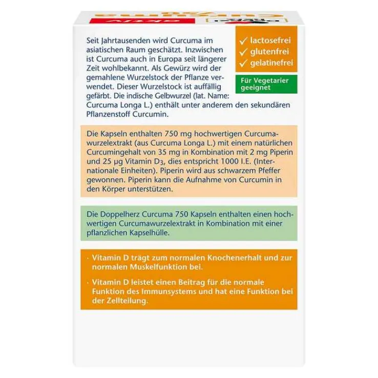 Die Doppelherz Curcuma 750 Kapseln enthalten einen hochwertigen Curcumawurzelextrakt in Kombination mit einer pflanzlichen Kapselhülle. Vitamin D trägt zum normalen Knochenerhalt und zur normalen Muskelfunktion bei.