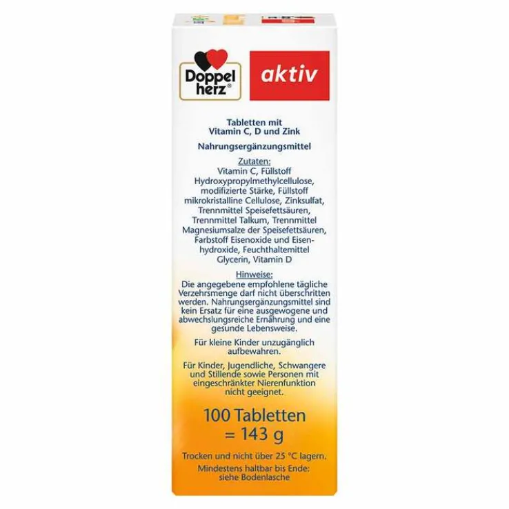 Vitamin C, Füllstoff Hydroxypropylmethylcellulose, modifizierte Stärke, Füllstoff mikrokristalline Cellulose, Zinksulfat, Trennmittel Speisefettsäuren, Trennmittel Talkum, Trennmittel Magnesiumsalze der Speisefettsäuren, Farbstoff Eisenoxide und Eisenhydroxide, Feuchthaltemittel Glycerin, Vitamin D