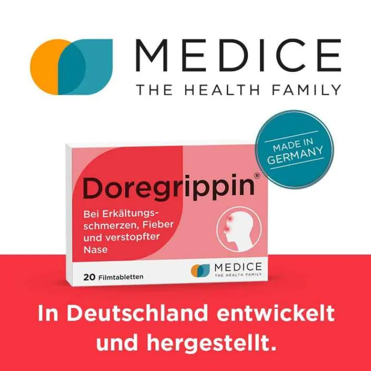 Doregrippin® 500 mg/ 10 mg Filmtabletten. Anwendungsgebiete: Zur kurzzeitigen Behandlung der Symptome von Erkältungen und grippalen Infekten, die mit Fieber, Kopf- und Gliederschmerzen und Schnupfen einhergehen. Für Kinder ab 11 Jahren und für Erwachsene. Ohne ärztlichen Rat nicht länger anwenden als in der Packungsbeilage vorgegeben! Zu Risiken und Nebenwirkungen lesen Sie die Packungsbeilage und fragen Sie Ihre Ärztin, Ihren Arzt oder in Ihrer Apotheke. Stand 03/2023 . MEDICE Arzneimittel, 58638 Iserlohn