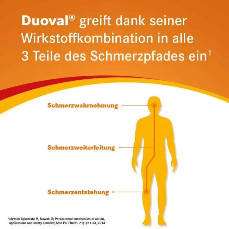 Duoval ® 500 mg/150 mg Filmtabletten. Zur Anwendung bei Erwachsenen. Wirkstoffe: Paracetamol und Ibuprofen. Anwendungsgebiete: Duoval wird zur kurzzeitigen symptomatischen Behandlung von leichten bis mäßig starken Schmerzen angewendet. Duoval ist speziell anwendbar bei Schmerzen, die durch alleinige Anwendung von Ibuprofen oder Paracetamol nicht gelindert werden können. Warnhinweise: Arzneimittel für Kinder unzugänglich aufbewahren. Bei Schmerzen oder Fieber ohne ärztlichen Rat nicht länger anwenden als in der Packungsbeilage vorgegeben! Enthält Lactose. Stand: 12/2024. Zu Risiken und Nebenwirkungen lesen Sie die Packungsbeilage und fragen Sie Ihre Ärztin, Ihren Arzt oder in Ihrer Apotheke