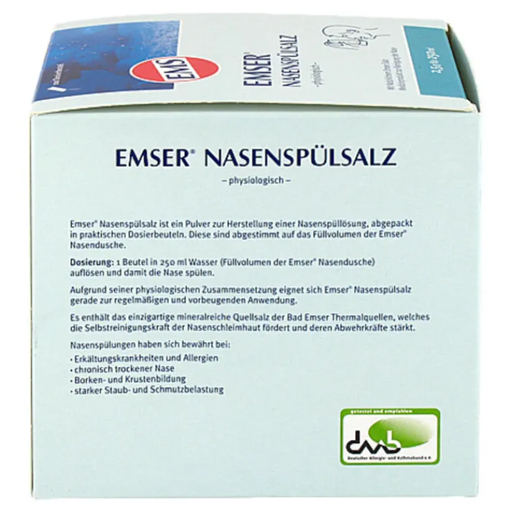 Emser® Nasenspülsalz wird für Spülungen der Nase eingesetzt. Spülungen der Nase sind immer dann sinnvoll, wenn die Nase intensiv gereinigt und befeuchtet werden soll. Dies ist z. B. bei vermehrter Staub- und Schmutzbelastung wichtig, aber auch bei vermehrter Schleim- und Krustenbildung. In Zeiten erhöhter Ansteckungsgefahr mit Erkältungskrankheiten beugen regelmäßige Nasenspülungen dem Entstehen von Erkältungskrankheiten vor. Bei Allergikern empfiehlt sich regelmäßiges Nasespülen bei Pollenflug, insbesondere abends vor dem Zubettgehen. Nasenspülungen sind auch zur Befeuchtung der Nasenschleimhaut geeignet und daher immer dann sinnvoll, wenn die Nasenschleimhaut aufgrund von Umwelteinflüssen zu trocken geworden ist, wie z. B. durch Klimaanlagen, Heizungsluft o. ä.
