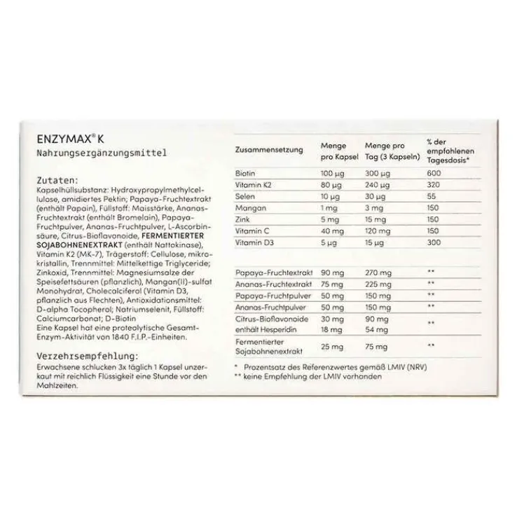 Kapselhüllsubstanz: Hydroxypropylmethylcellulose, amidiertes Pektin; Papaya-Fruchtextrakt (enthält Papain), Füllstoff: Maisstärke, Ananas-Fruchtextrakt (enthält Bromelain), Papaya-Fruchtpulver, Ananas-Fruchtpulver, L-Ascorbinsäure, Citrus-Bioflavonoide, fermentierter Sojabohnenextrakt (enthält Nattokinase), Vitamin K2 (MK-7), Trägerstoff: Cellulose, mikrokristallin, Trennmittel: Mittelkettige Triglyceride; Zinkoxid, Trennmittel: Magnesiumsalze der Speisefettsäuren (pflanzlich), Mangan(II)-sulfat Monohydrat, Cholecalciferol (Vitamin D3, pflanzlich aus Flechten), Antioxidationsmittel: D-alpha Tocopherol; Natriumselenit, Füllstoff: Calciumcarbonat; D-Biotin