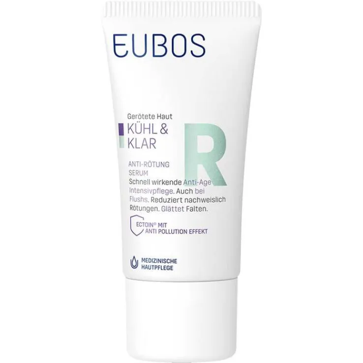 Das Eubos Kühl & Klar Anti-Rörung Serum ist ein medizinisches Pflegeprodukt zur Reduzierung von Hautirritationen und Rötungen mit Anti Age-Effekt. Es sorgt für schnelle Hilfe bei Flushs. Das natürliche Stressschutzmolekül Ectoin reduziert Rötungen und versorgt die Haut bis zu 7 Tage mit Feuchtigkeit. Der enthaltene Phyto-Aktivstoffkomplex mit italienischer Immortelle hemmt Entzündungsvorgänge und stärkt die Gefäße. Er reduziert sichtbar Rötungen und Schwellungen und kann Therapie begleitend bei Couperose und Rosacea eingesetzt werden.