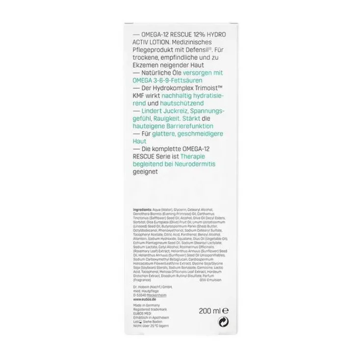Die Eubos Omega-12 Rescue 12% Hydro Activ Lotion ist ein medizinisches Pflegeprodukt mit Defensil. Sie eignet sich für trockene, empfindliche und zu Ekzemen neigende Haut. Natürliche Öle versorgen die Haut mit Omega 3-6-9-Fettsäuren. Der Hydrokomplex TrimoistTM KMF wirkt nachhaltig hydratisierend und hautschützend, lindert Juckreiz, Spannungsgefühl, Rauigkeit und stärkt die hauteigene Barrierefunktion. Die Haut wird glatter und geschmeidiger. Die komplette Omega-12 Rescue Serie ist Therapie begleitend bei Neurodermitis geeignet. Die Verträglichkeit wurde dermatologisch getestet.