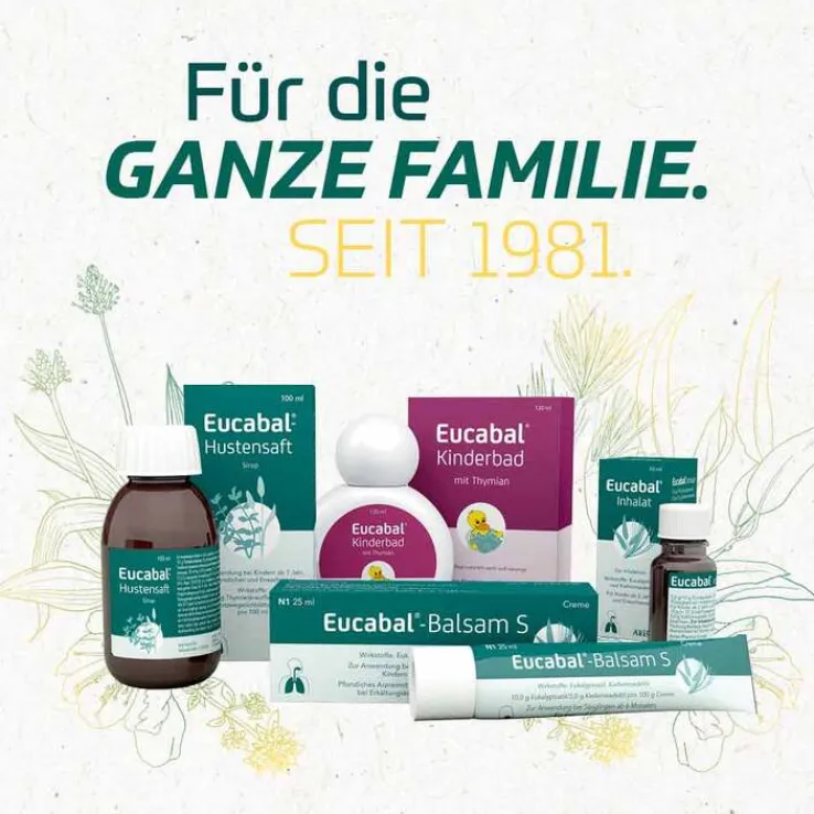Eucabal®-Balsam S Creme. (Ap). Wirkstoffe: Eukalyptusöl, Kiefernnadelöl. Zur Besserung der Beschwerden bei Erkältungskrankheiten der Atemwege mit zähflüssigem Schleim. Zu Risiken und Nebenwirkungen lesen Sie die Packungsbeilage und fragen Sie Ihre Ärztin, Ihren Arzt oder in Ihrer Apotheke. Enthält Cetylstearylalkohol. Packungsbeilage beachten. (Stand Januar 2020). Aristo Pharma GmbH, Wallenroder Str. 8-10, 13435 Berlin.