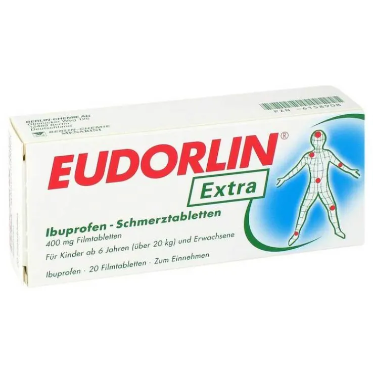 EUDORLIN® Extra Ibuprofen-Schmerztabletten. Wirkstoff: Ibuprofen. Anwendungsgebiete: Symptomatische Behandlung von leichten bis mäßig starken Schmerzen, Fieber. Warnhinweis: Bei Schmerzen oder Fieber ohne ärztlichen Rat nicht länger anwenden als in der Packungsbeilage vorgegeben! Zu Risiken und Nebenwirkungen lesen Sie die Packungsbeilage und fragen Sie Ihre Ärztin, Ihren Arzt oder in Ihrer Apotheke. BERLIN-CHEMIE AG, 12489 Berlin.