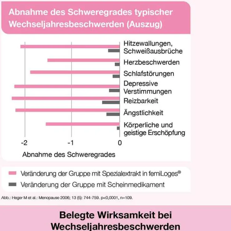 femiLoges®, Wirkstoff: Rhapontikrhabarberwurzel-Trockenextrakt. femiLoges® wird angewendet zur Besserung der durch die Wechseljahre bedingten psychischen und neurovegetativen Beschwerden wie Hitzewallungen/Schweißausbrüche, Schlafstörungen, depressive Verstimmungen und Ängstlichkeit. Warnhinweise: Enthält Lactose und Saccharose. Gegenanzeigen: Bestehen oder Verdacht auf einen östrogenabhängigen Tumor, da nicht bekannt ist, ob Rhapontikrhabarberwurzel-Trockenextrakt das Wachstum eines östrogenabhängigen Tumors beeinflusst. Zu Risiken und Nebenwirkungen lesen Sie die Packungsbeilage und fragen Sie Ihre Ärztin, Ihren Arzt oder in Ihrer Apotheke. Stand: 11/2023