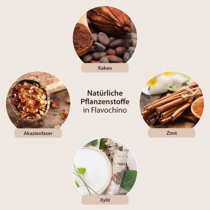 Flavochino hat einen Anteil von über 50 % hochwertigem Kakaopulver und bietet intensiven schokoladigen Genuss! Der Kakao ist mit dem aus Pflanzen gewonnenen Süßungsmittel Xylit gesüßt, das auch als Birkenzucker bekannt ist. Xylit enthält weniger Kalorien als Zucker – so können Sie unbeschwert genießen.