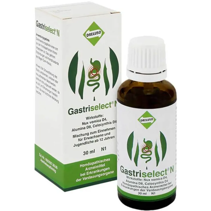 Gastriselect N. Die Anwendungsgebiete leiten sich von den homöopathischen Arzneimittelbildern ab. Dazu gehören: Entzündungen und Krampfzustände des Magen-Darm-Kanals. Zusammensetzung: 10 g enthalten: Nux vomica D4 dil. 3,33 g, Alumina D8 dil. 3,33 g, Colocynthis D4 dil. 3,33 g. Enthält 53 Vol-% Alkohol. Gastriselect N enthält kein Schöllkraut. Zu Risiken und Nebenwirkungen lesen Sie die Packungsbeilage und fragen Sie Ihre Ärztin, Ihren Arzt oder in Ihrer Apotheke.