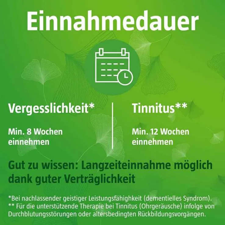 Zur Behandlung von Vergesslichkeita sollte die optimale Behandlungsdauer falls nicht anders verordnet mindestens 8 Wochen betragen. Nach einer Behandlungsdauer von 3 Monaten ist von der Ärztin oder vom Arzt zu überprüfen, ob die Weiterführung der Behandlung noch gerechtfertigt ist. Zur unterstützenden Behandlung von Ohrgeräuschenb sollte die optimale Behandlungsdauer falls nicht anders verordnet zwischen 12 Wochen und 6 Monaten liegen.