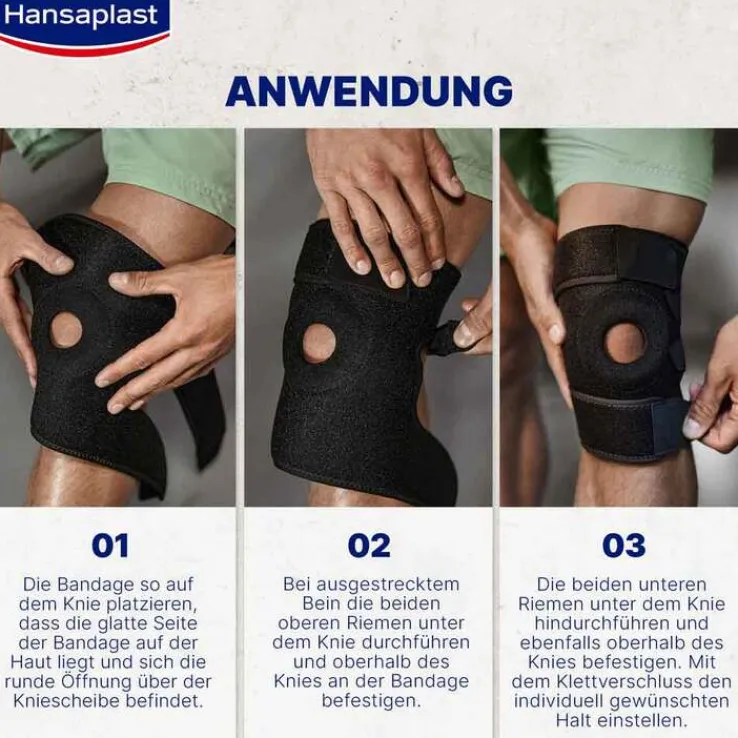 Es wird empfohlen, die Kniebandage bei Aktivitäten zu tragen, die zu Beschwerden führen. Knie-Bandagen werden normalerweise direkt auf der Haut getragen. Wenn es jedoch angenehmer ist, kann die Bandage auch über dünner, enganliegender Kleidung getragen werden. Die Bandage kann sowohl am rechten Knie als auch am linken Knie getragen werden. Für detaillierte Anwendungshinweise bitte die Informationen auf der Faltschachtel beachten.