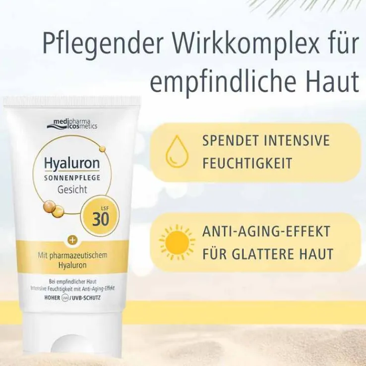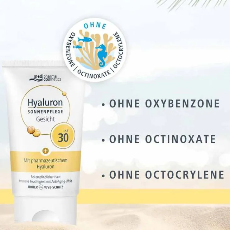 Die Hyaluron Sonnenpflege Gesicht LSF 30 von medipharma cosmetics ist eine feuchtigkeitsspendende Sonnencreme, die empfindliche und trockene Haut schützt, pflegt und gleichzeitig einen zuverlässigen UV-Schutz bietet – perfekt für sonnige Tage und Reisen.