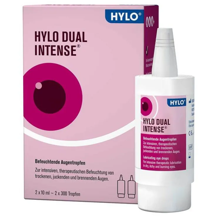 Die hohe Qualität der in den HYLO® Produkten verwendeten Hyaluronsäure bewirkt eine gleichmäßige, stabile und besonders langanhaltende Befeuchtung der Augenoberfläche. HYLO DUAL INTENSE® enthält mit 0,2 % eine besonders hohe Konzentration an Hyaluronsäure, ist hochviskos und kann chronische Beschwerden lindern und so das Auge dauerhaft vor Reizungen schützen. Durch die Benetzung dringen Fremdkörper und Reizstoffe aus der Umwelt nicht mehr so leicht zur Augenhornhaut vor, wodurch sich das Risiko einer Entzündung reduziert.