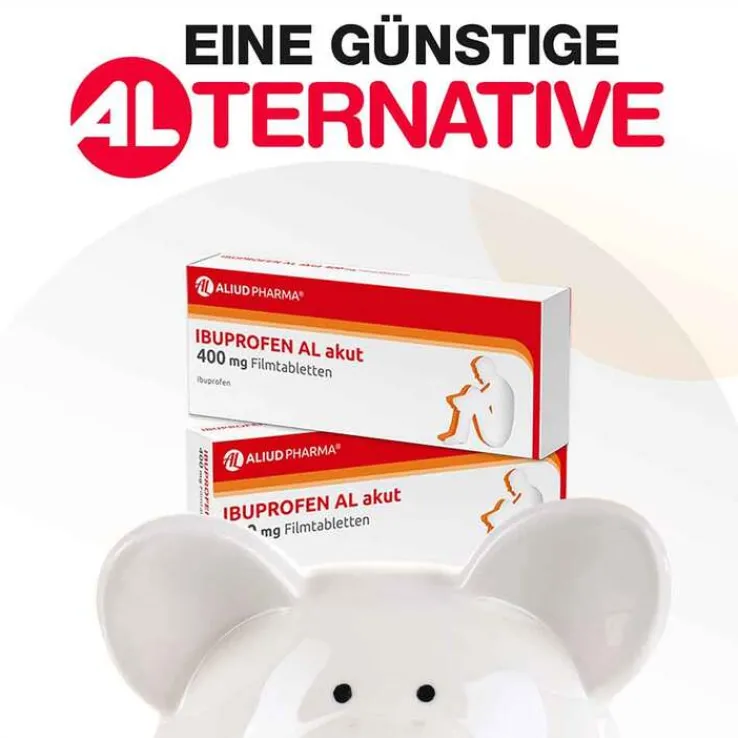 IBUPROFEN AL akut 400 mg Filmtabletten Zur Anwendung bei Kindern ab 6 Jahren, Jugendlichen und Erwachsenen. Wirkstoff: Ibuprofen. Zur kurzzeitigen symptomatischen Behandlung von leichten bis mäßig starken Schmerzen, wie Kopfschmerzen, Zahnschmerzen, Regelschmerzen, Fieber. Hinweis: Bei Schmerzen oder Fieber ohne ärztlichen Rat nicht länger anwenden als in der Packungsbeilage vorgegeben! Zu Risiken und Nebenwirkungen lesen Sie die Packungsbeilage und fragen Sie Ihre Ärztin, Ihren Arzt oder in Ihrer Apotheke. ALIUD PHARMA GmbH, Postfach 1380, 89146 Laichingen Stand: Dezember 2023