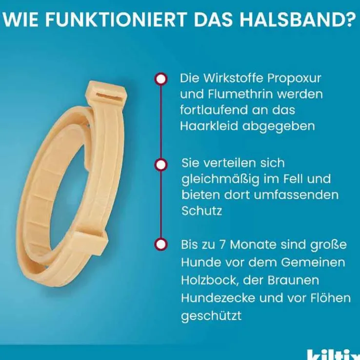 Das Halsband für kleine Hunde wirkt nach dem Anlegen gegen Zecken und Flöhe bis zu 6 Monate, das Halsband für mittelgroße Hunde und das Halsband für große Hunde wirken nach dem Anlegen gegen Zecken und Flöhe bis zu 7 Monate.