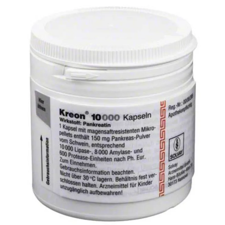 Kreon 10 000 Kapseln sind ein Arzneimittel zum Ersatz von Verdauungsenzymen der Bauchspeicheldrüse (Pankreasenzyme).