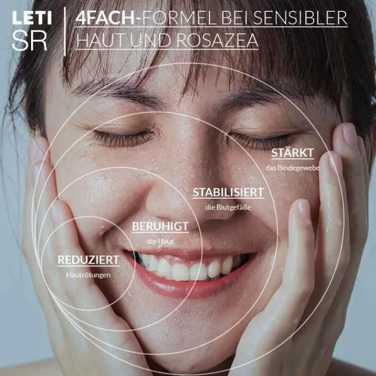 Faktoren wie genetische Veranlagung, Stress oder UV-Strahlung können feinste Blutgefäße (Mikrokapillargefäße) der Haut schwächen und weiten. Dadurch kommt es zu Rötungen im Gesicht, sichtbaren Äderchen oder zu Rosazea. Die aktiven Inhaltsstoffe in LETI SR bieten einen innovativen doppelten Schutz der Blutgefäße. Sie stabilisieren sie und stärken ihr stützendes Bindegewebe (Anti-Aging-Effekt).¹ Das Ergebnis: weniger Rötungen² , mehr Straffung. LETI SR wurde speziell für empfindliche und gerötete Haut sowie Rosazea Subtyp I entwickelt.