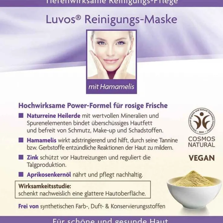 Zertifizierte Naturkosmetik, hergestellt in Deutschland: Das Familienunternehmen Luvos mit 100-jähriger Tradition stellt dieses Produkt nach höchstem Standard von COSMOS NATURAL / BDIH her. Es ist selbstverständlich vegan, tierversuchsfrei. Die Hautverträglichkeit ist dermatologisch bestätigt. Die Reinigungs-Maske ist vollkommen frei von problematischen Zusatzstoffen wie Mikroplastik, Mineralöl, Parabenen, Silikonen, Paraffinen, PEGs, künstlichen Farb-, Duft- und Konservierungsstoffen.