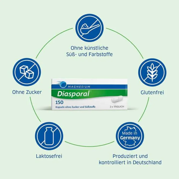 MAGNESIUM Diasporal® 150 Kapseln. (Wirkstoff: Magnesiumoxid) Anwendungsgebiet: Magnesiummangel, wenn er Ursache für Störungen der Muskeltätigkeit (Neuromuskuläre Störungen, Wadenkrämpfe) ist. Zu Risiken und Nebenwirkungen lesen Sie die Packungsbeilage und fragen Sie Ihre Ärztin, Ihren Arzt oder in Ihrer Apotheke. Protina Pharm. GmbH, D-85737 D-Ismaning