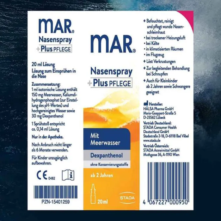 Bei erhöhten Belastungen wie z. B. Reizung durch trockene Heizungsluft oder durch Kälte, bei Schnupfen oder auch bei Beschwerden während einer Allergie ist die Unterstützung und Pflege der gestressten Nasenschleimhaut sinnvoll. Genau da wirkt MAR® Nasenspray Plus Pflege: Es ist heilungsfördernd bei wunder Nasenschleimhaut mit 3% Dexpanthenol. MAR® Nasenspray Plus Pflege ist auch für Kleinkinder ab 2 Jahren geeignet. MAR® Nasenspray Plus Pflege befeuchtet, reinigt, regeneriert und pflegt die Nasenschleimhaut: