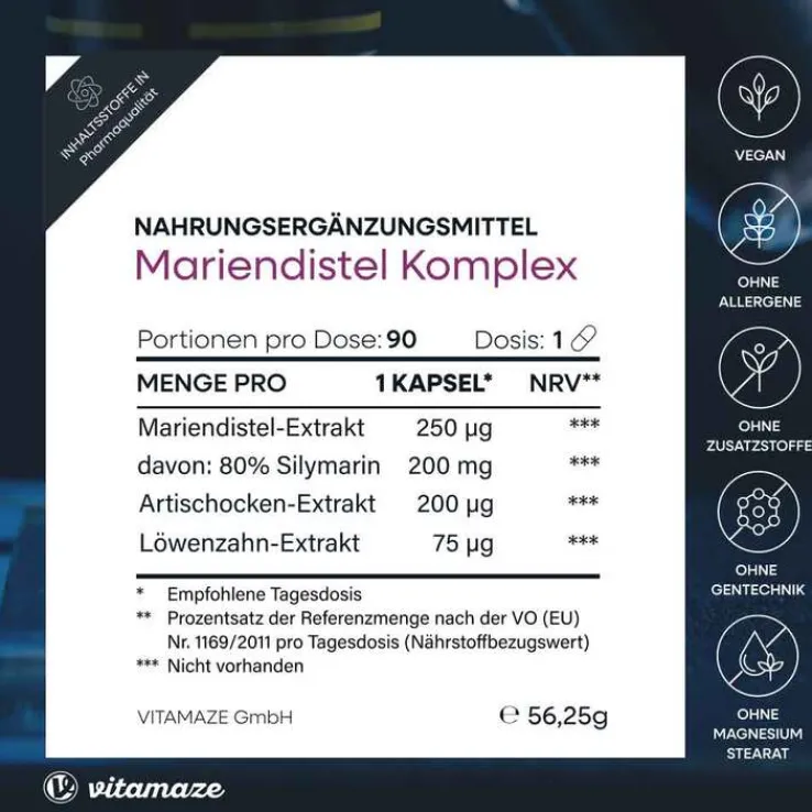 Jede vegane Kapsel enthält 250 mg Mariendistel Extrakt mit 80% Silymarin und ist zusätzlich angereichert mit 200 mg Artischocken Extrakt und 75 mg Löwenzahn Extrakt – und das in bester Bioverfügbarkeit und Qualität von Vitamaze.