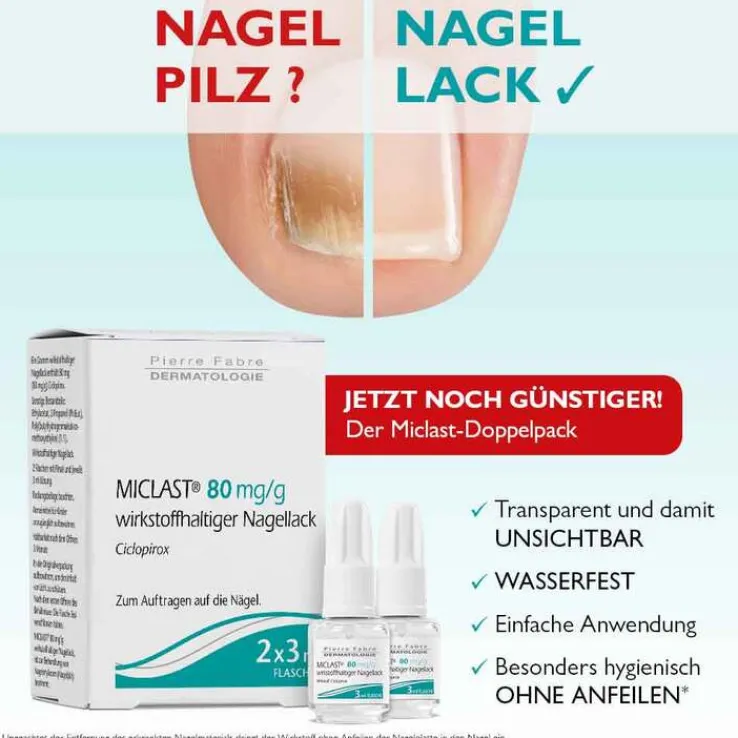 MICLAST® 80 mg/g wirkstoffhaltiger Nagellack. Wirkstoff: Ciclopirox. Anwendungsgebiet: Behandlung von leichtem bis mittelschwerem Nagelpilz-Befall (Onychomykose) der Finger- und Zehennägel. Der Wirkstoff Ciclopirox dringt in den Nagel ein und tötet die Pilze ab. Zu Risiken und Nebenwirkungen lesen Sie die Packungsbeilage und fragen Sie Ihre Ärztin, Ihren Arzt oder in Ihrer Apotheke.