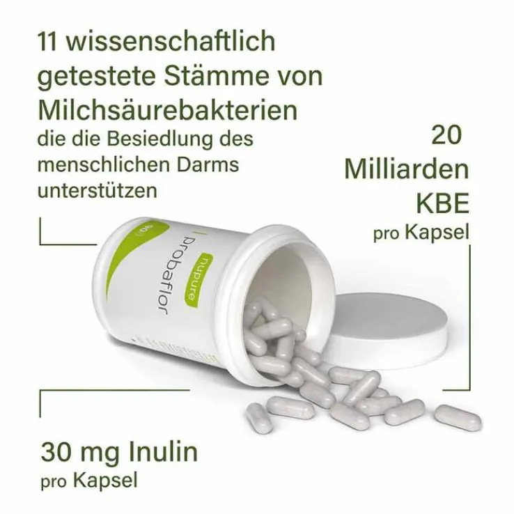 Nupure probaflor enthält 11 ausgewählte Stämme Milchsäurebakterien und Bifidobakterien, die natürlicherweise den menschlichen Darm besiedeln. Dort sind sie Teil der sogenannten Darmflora. Nupure probaflor enthält mindestens 20 Mrd. KBE zum Ende der Haltbarkeit.