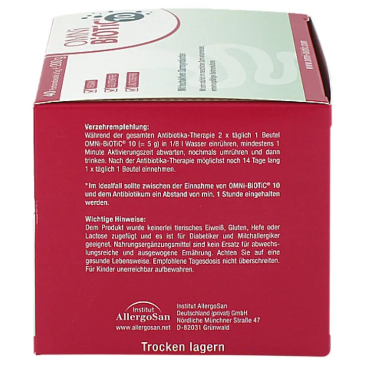 Während der gesamten Anitbiotika – Therapie 2 x täglich 1 Beutel Omni Biotic 10 (= 5 g) in 1/8 l Wasser einrühren, mindestens 1 Minute Aktivierungszeit abwarten, nochmals umrühren und dann trinken. Nach der Antibiotika – Therapie möglichst noch 14 Tage lang 1 x täglich 1 Beutel einnehmen.