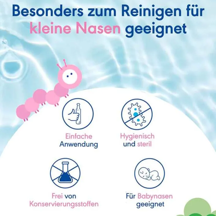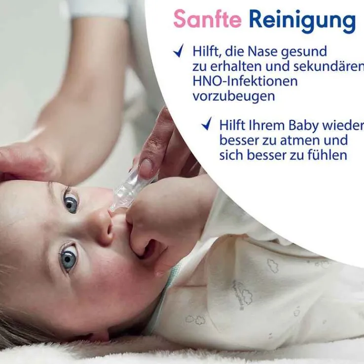 - Sanfte Reinigung der Nasenhöhlen: Die Einzeldosispipetten helfen, die Nase Ihres Babys zu befreien, damit es wieder besser atmen, trinken und schlafen kann