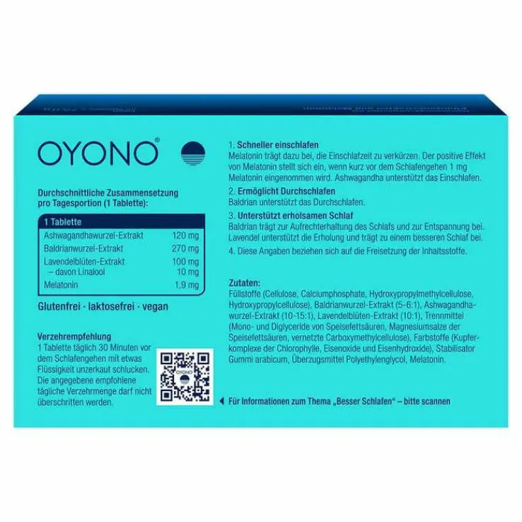 Die innovative 3-Phasen-Tablette Oyono enthält ausgewählte pflanzliche Inhaltsstoffe, kombiniert mit dem körpereigenen Stoff Melatonin¹. Melatonin dient zur Verkürzung der Einschlafzeit¹.