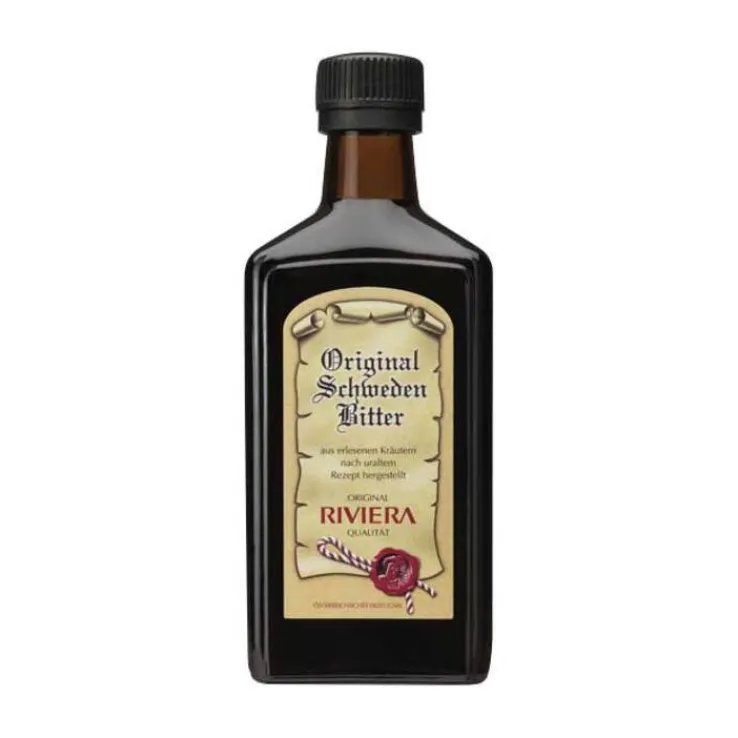Original Schwedenbitter Riviera ist ein aus erlesenen Kräutern nach einem uralten Rezept hergestelltes Qualitätsprodukt. Die Bitterstoffe von Wermutkraut und Enzianwurzel sorgen für den typischen Geschmack.