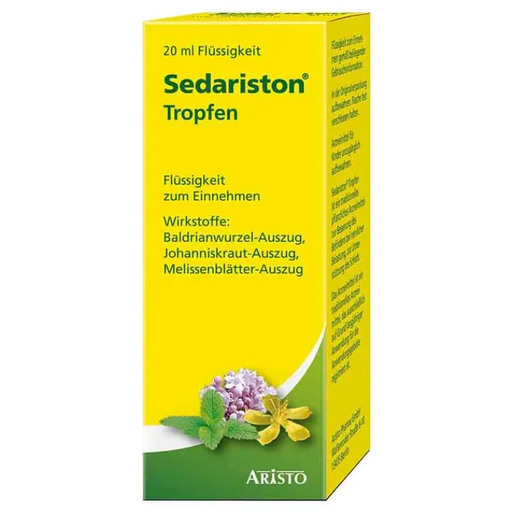 Sedariston® Tropfen (Apothekenpflichtig), Wirkstoffe: Auszüge aus Baldrianwurzeln, Johanniskraut und Melissenblättern. Anw.: Traditionelles pflanzliches Arzneimittel zur Besserung des Befindens bei nervlicher Belastung, zur Unterstützung des Schlafs ausschließlich auf Grund langjähriger Anwendung. Enthält 53 Vol.-% Alkohol. (Stand Sept. 2019) Aristo Pharma GmbH, Wallenroder Straße 8-10, 13435 Berlin.