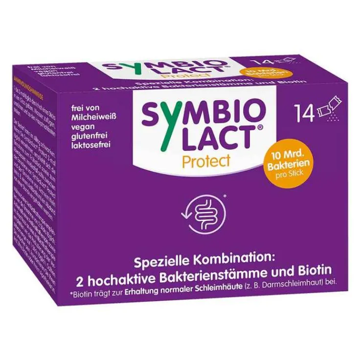 SymbioLact® protect ist ein Nahrungsergänzungsmittel, das Biotin sowie zwei Stämme Milchsäure bildender Bakterien enthält.